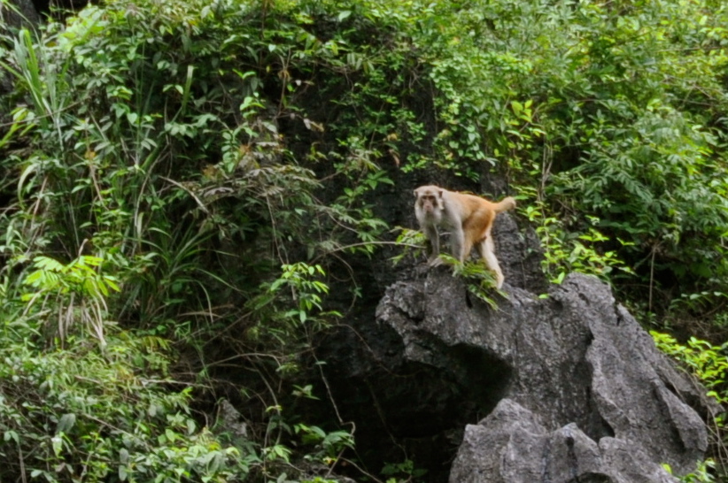 Wild Rhesus Macaque spotted climbing the karsts in Mingshi